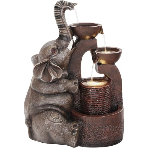 Click for More Images Dynamic Elephant Fountain: Approximately 20-inch resin fountain featuring an elephant sculpture channeling water into three tiers of bowls to create a modern waterfall scene. A refined piece of art to enhance gardens,...