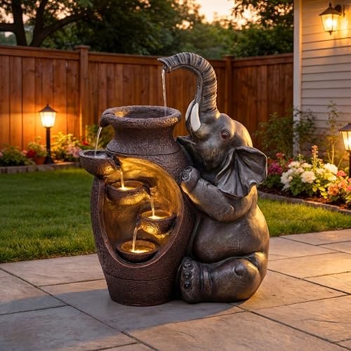Click for More Images WHIMSICAL ELEPHANT DESIGN: This outdoor water fountain showcases a playful elephant spraying water into a large jar. Featuring handcrafted embossed textures and antique rustic details, it adds natural charm and fun to any...