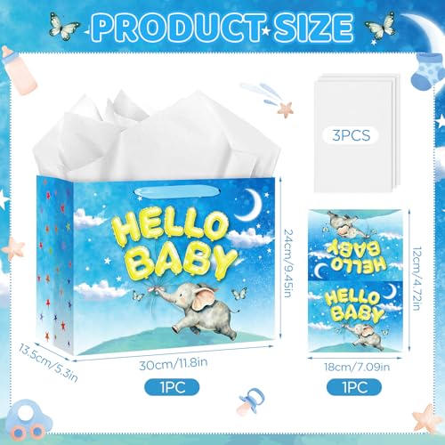Click for More Images Elephant Gift Bag Set: You'll receive 1 elephant baby shower gift bag, 1 elephant baby shower themed greeting card, and some white tissue paper. Use the tissue paper to stylishly wrap your gifts, write your sincere wishes on...