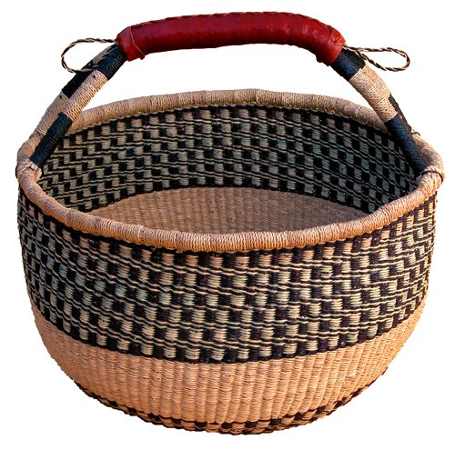 All these baskets are hand-woven by villagers in Africa using natural, locally available materials. By purchasing these baskets, you are helping to support many families of weavers. Large (15″-17″ diameter), strong, durable, colorful and every one is unique, being entirely hand-made. While size will be in the 15-17″ range, colors and patterns will vary as each basket is individually created. The picture shown is a reference for the basic style of the basket. Each is a unique design and will depend on the village and materials available. When this basket is delivered, it will be folded in a box. Use the following directions for reshaping it. Start by running warm water over the entire basket – you can even get the handle and tag wet. Allow the water to soak in and then shake off any excess water. Allowing the water to completely soak in makes the basket very pliable. Put the basket down on a flat surface, roll it around and set into the desired shape. Allow to air dry.
