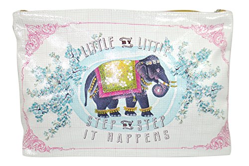 This amazing large cosmetic case measures 14" x 9" x 2" lined with colorful patterns and zip closed with a stamped metal lotus charm and coordinating tassel. Made from a VERY durable oil cloth material. You can use it for clutch purse, travel...