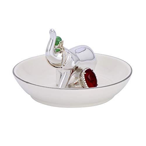 Ceramic ring dish that will complement your dresser or mirrored vanity by helping you keep your rings and small jewelry trinkets organized. Measuring 4" X 4", this dish was crafted from white ceramic and features a golden elephant in the center...