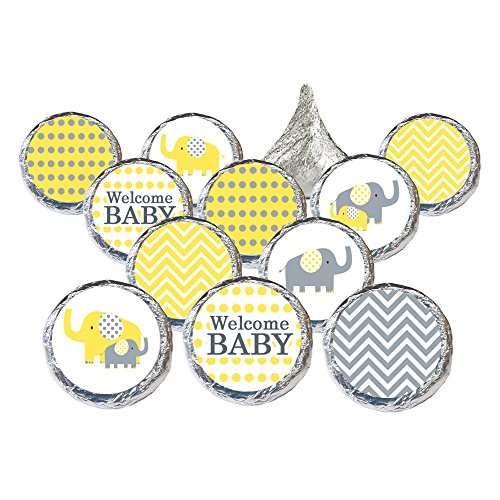 Add these fun Yellow and Gray Elephant Baby Shower Stickers to a Hershey Kiss for a simple and easy baby shower favor or table decoration! Each package includes 324 self-adhesive stickers for you to place on the candy of your choice (candy not...