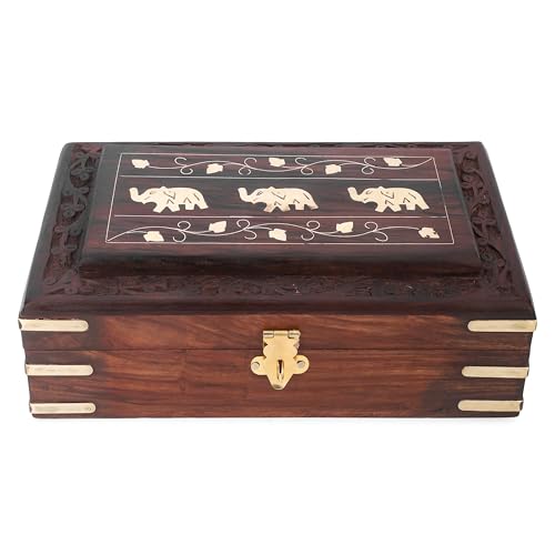 Click for More Images ?HAND CARVED ELEPHANT DESIGN WITH BRASS INLAY?: This jewelry box features a brass inlay elephant charm, symbolizing strength, wisdom, and good luck. Combined with floral carvings, it offers a captivating and culturally...