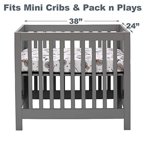 Click for More Images Breathable 100% cotton fitted mini crib sheetTossed animal print includes lions, giraffes, zebras, and elephantsSized at 24” X 38” and fits a mini crib mattress as well as most Pack N Plays and portable cribs (not...