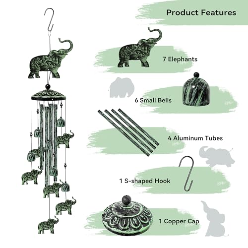 Click for More Images Elephant Unique Design:This Elephant wind chime is handmade with 4 thickened aluminum tubes, 7 lifelike elephants, and 6 bells. The "S" shaped hook allows you to hang the wind chime on your patio or anywhere you want. Black...
