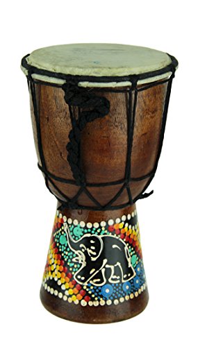 This beautiful 8 inch tall Aboriginal style djembe (native drum) makes an awesome decorative piece for themed rooms, but is also quite playable. The approximately 4 1/2 inch diameter head is made of natural goat skin, and the drum is...