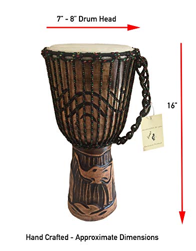 Click for More Images Djembe Drum African Bongo Congo Wood Drum - Features An Intricate Design - Carved By Skilled Artisans - NOT Made In ChinaLarge 8" Drumming Surface For The Perfect Sound - Features A Tight Goat Skin Drum Head For Balanced...
