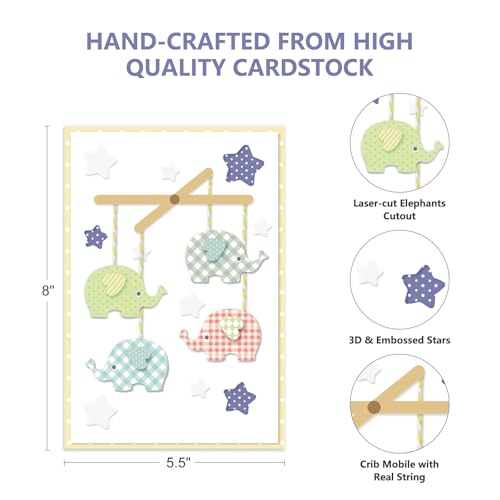 Click for More Images Adorable 3D Design for a Memorable Baby Shower - Celebrate the upcoming arrival of a precious boy or girl with this charming baby shower card featuring a lifelike 3D crib mobile! Four colorful elephants with heart-shaped...