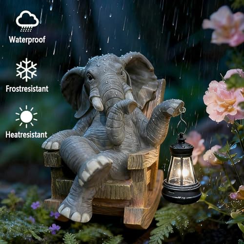 Click for More Images Charming Design & Perfect Size: This unique solar elephant statue captures a heartwarming moment of a cute elephant relaxing on a rocking chair, holding a string of LED lights. Measuring 7.68"×8.2"×7.68" and weighing...