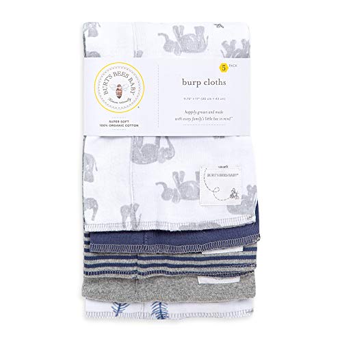 Burt’s Bees Baby – Burp Cloths, 5-Pack Extra Absorbent 100% Organic Cotton Burp Cloths (Wandering Elephants)