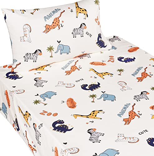 Scientific Sleep Zoo Animals 100% Cotton Cozy Fun Twin Bed Sheet Set, Flat Sheet & Fitted Sheet & Pillowcase Boys Girls Bedding Set
