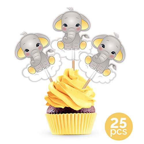 Yellow Elephant Cupcake Cake Toppers – Gender Neutral Baby Shower Birthday Party Decorations Supplies – 25 Pieces
