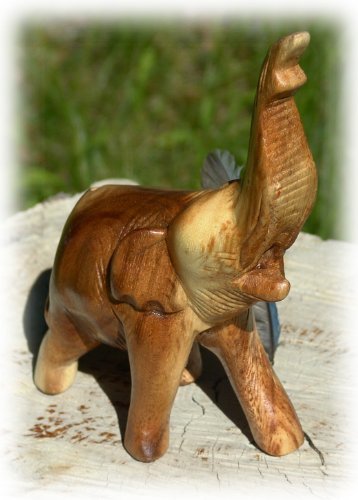 these wonderfully detailed hand carved wooden elephants make a trumpeting sound sort of like the real thing when you blow into the hole on their back’s. Wood-grain/shading varies.