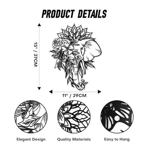Click for More Images Elegant Elephant & Lotus Design: This elephant wall art features a detailed elephant head adorned with a blooming lotus, symbolizing wisdom and purity. The intricate metalwork blends cultural motifs with universal elegance,...