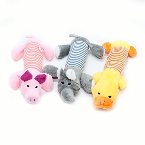 Package included: 3X Squeaky plush dog toys 3 Pcs Squeaky plush dog toysSqueaky Dog Toys: yellow duck, pink pig and gray elephantComfort and satisfies your dog's natural urge to chew and help its teeth and gums to grow healthilyMade of...