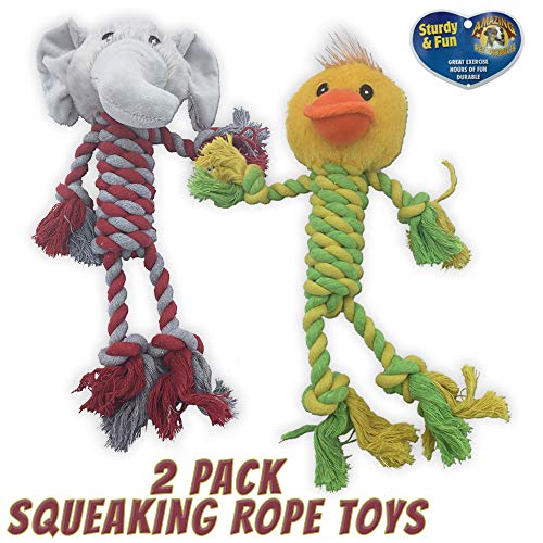 2 Pack of durable and long lasting 13 inch rope toys with plush heads and squeakers. I will get 1 Elephant and 1 Duck. It is recommended that pets always be supervised when playing with toys. Do not let pets play with any broken or damaged toy. 2...