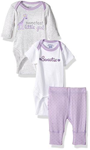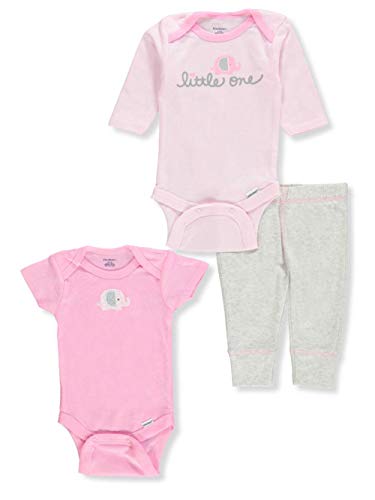 Take your newest miracle home in this cute and cozy girls' 3-piece take me home set by Gerber this set comes complete with one long sleeve onesies bodysuit, one short sleeve onesies bodysuit, and a pair of active pants with adorable embroidered...