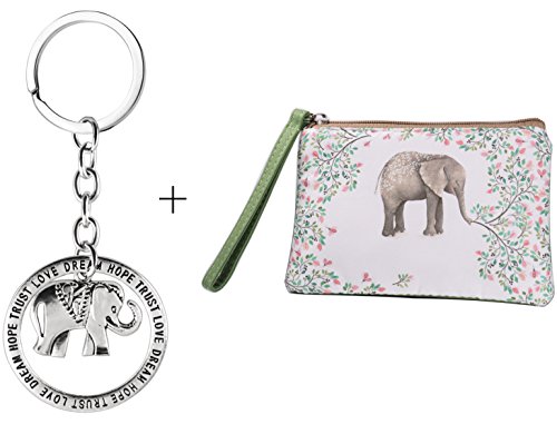 Package Includes: Elephant Keychain + Coin Purse Package Includes: Elephant Keychain + Coin PurseElephant Keychain: Retro silver, made with AlloyCoin Purse: Elephant printed zipper bag with handle. Useful for coins, changes, keys, cellphone,...