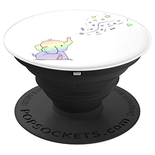 Animal design PopSocket, Rainbow Baby Elephant ~ Spraying Rainbow Confetti Hearts ~ Pink, teal, lavender purple, orange, yellow and green colors on this cute baby elephant. Spraying or blowing rainbow confetti out of her trunk. Cool white...