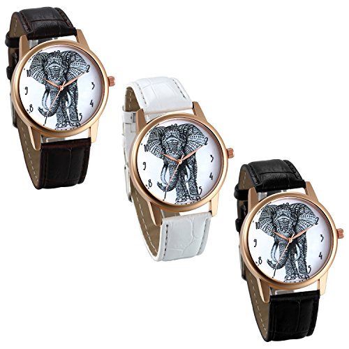 JewelryWe 3 PACK Wholesale Elephant Sketch Dial Easy Reader Leather Band Analog Quartz Wrist Watches